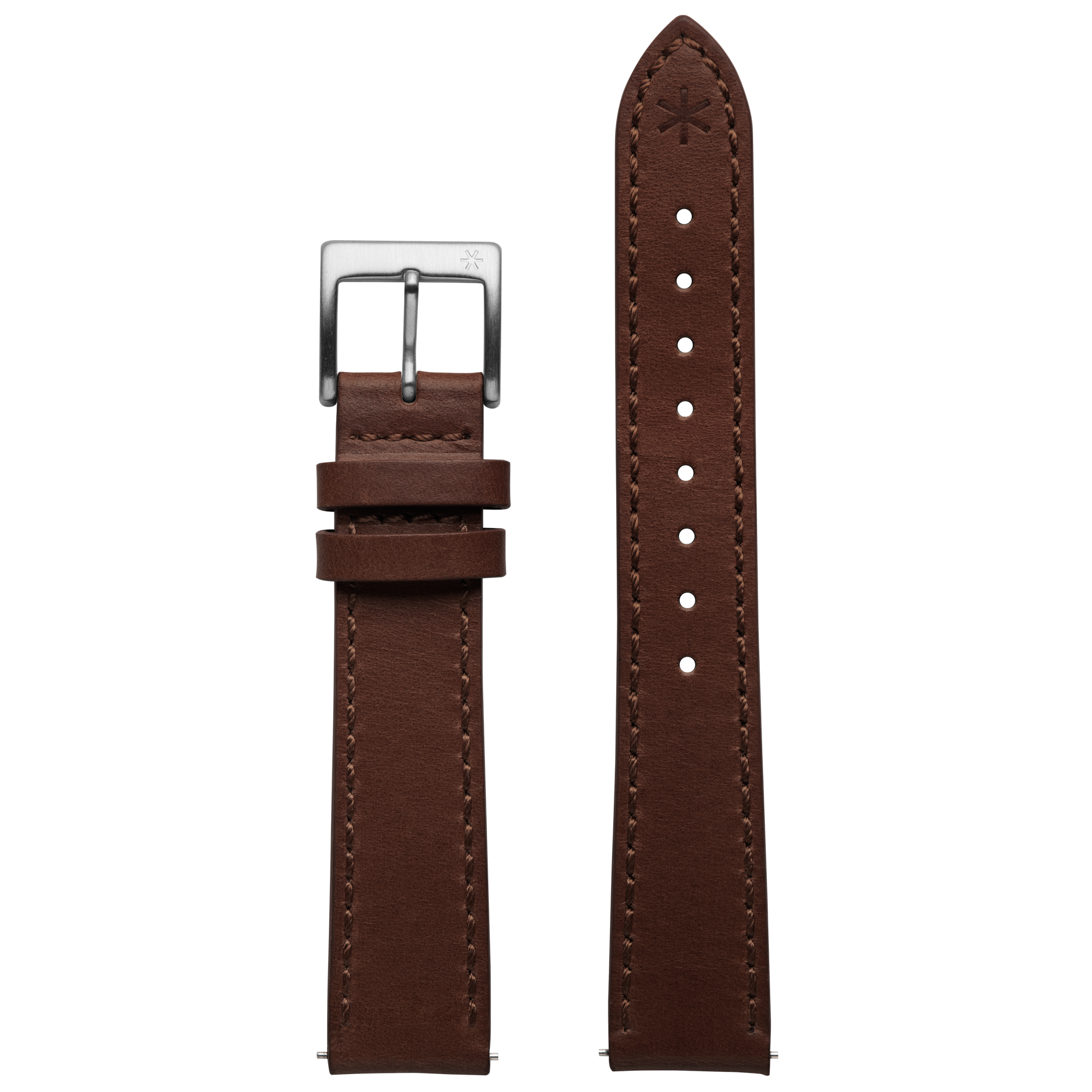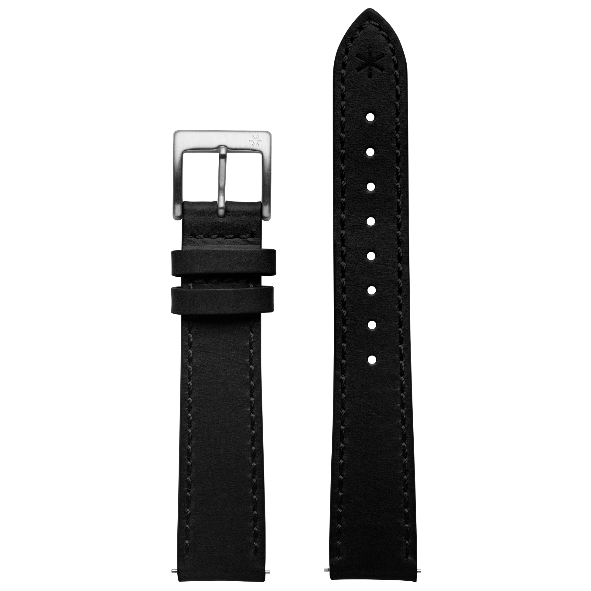 Full-stitched 18mm genuine leather strap with stainless steel buckle and quick release spring bar system.